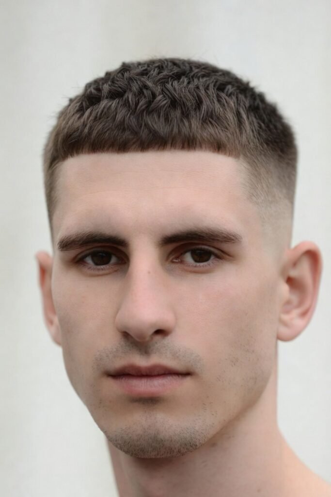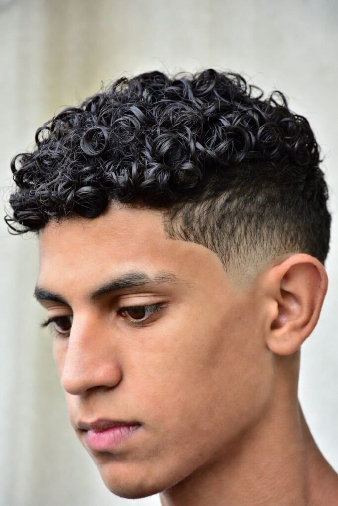 Men with natural curls can rock a modern crew cut by keeping curls short and controlled on top. A fade on the sides enhances texture contrast.