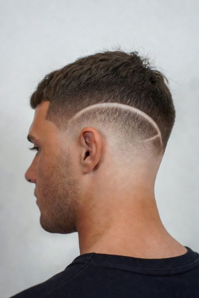 For a bold twist, adding a shaved line design to the fade creates artistic detail. The crew cut keeps the main structure simple while the design adds personality.