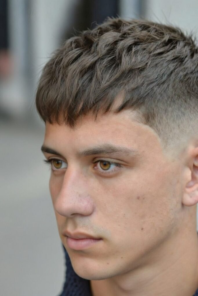 A messy crew cut with a low skin fade offers a relaxed yet trendy appearance. The top is lightly textured and styled casually, while the skin fade adds crispness.