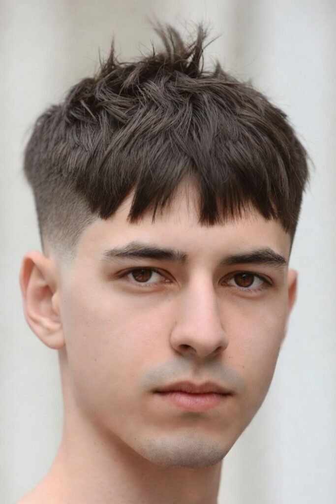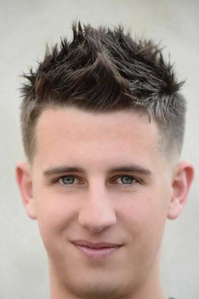 For a youthful and energetic vibe, the spiky crew cut with fade is a strong choice. The textured top is styled upward while the fade keeps the sides ultra-clean.