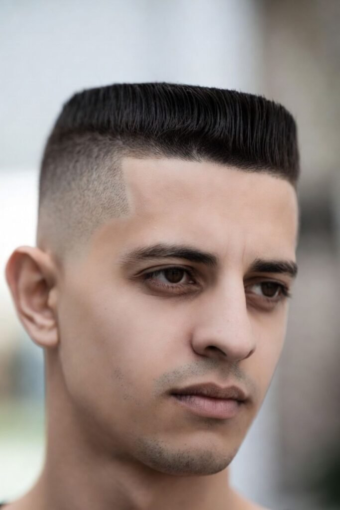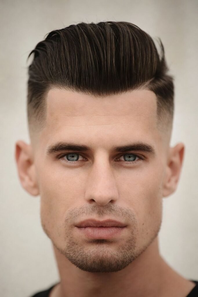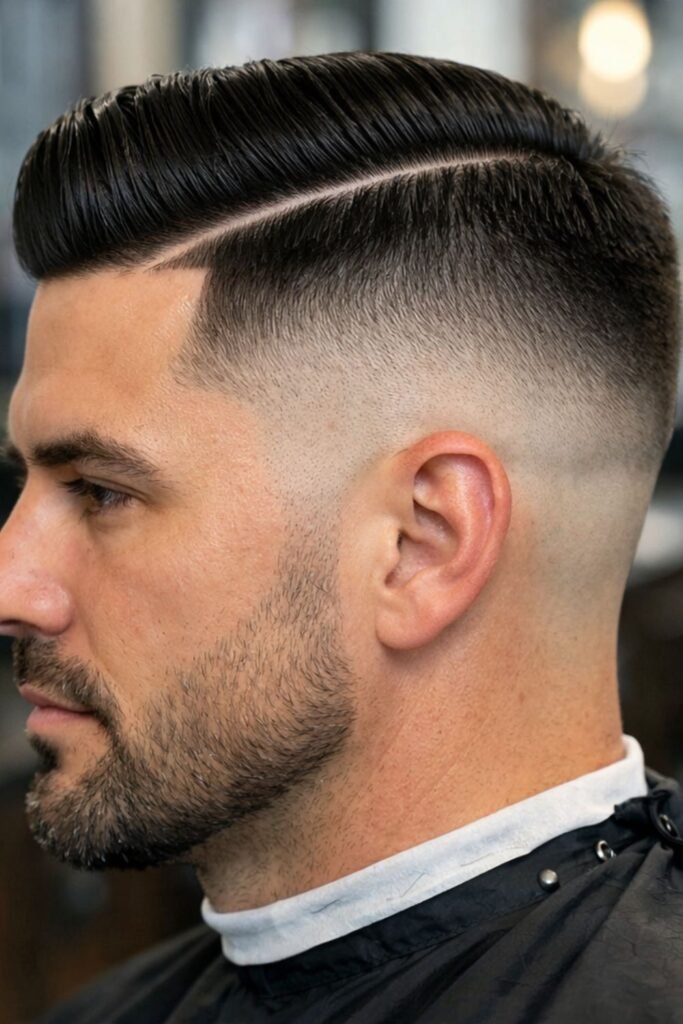 The high and tight is a staple in military grooming. This style features extremely short sides and back—often faded or shaved high up—while keeping slightly more length on top. The contrast between the sides and top gives it a bold, structured look.