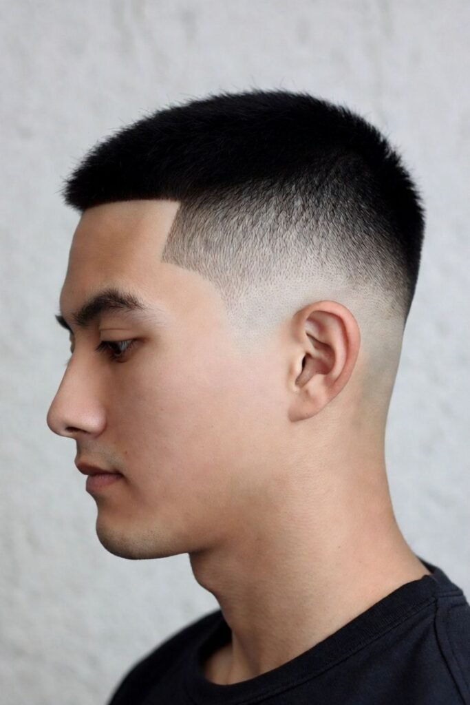 The skin fade adds a modern edge while keeping the style low maintenance. Regular trims keep the fade clean, but daily upkeep is minimal. It’s a stylish upgrade to the traditional buzz cut.