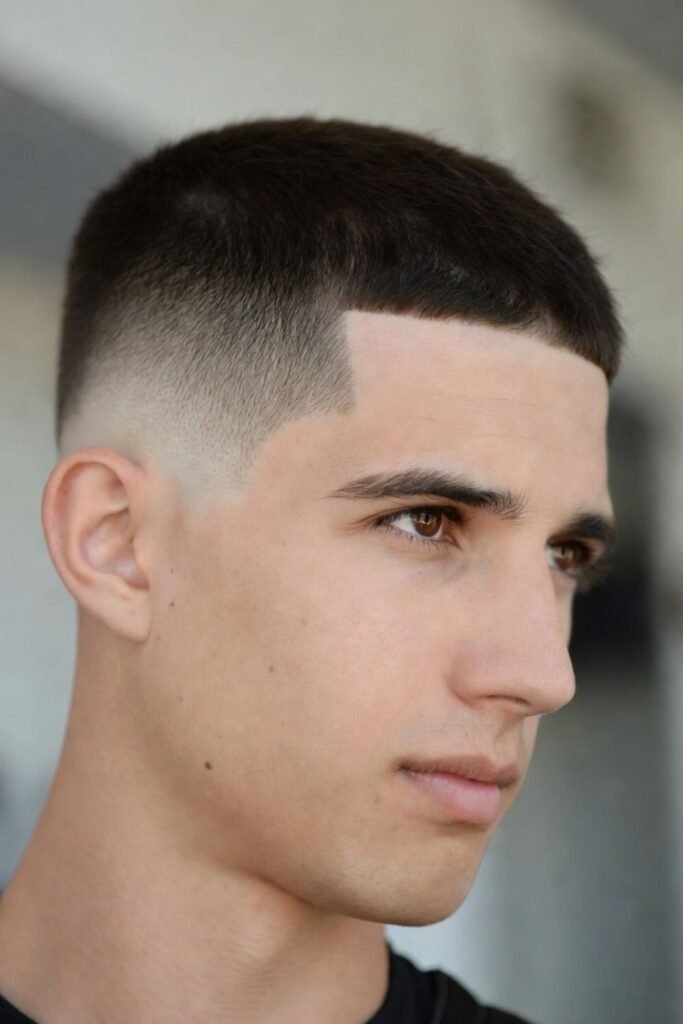 This variation combines a classic buzz cut with a skin fade on the sides. The fade transitions smoothly from bare skin to slightly longer hair on top.