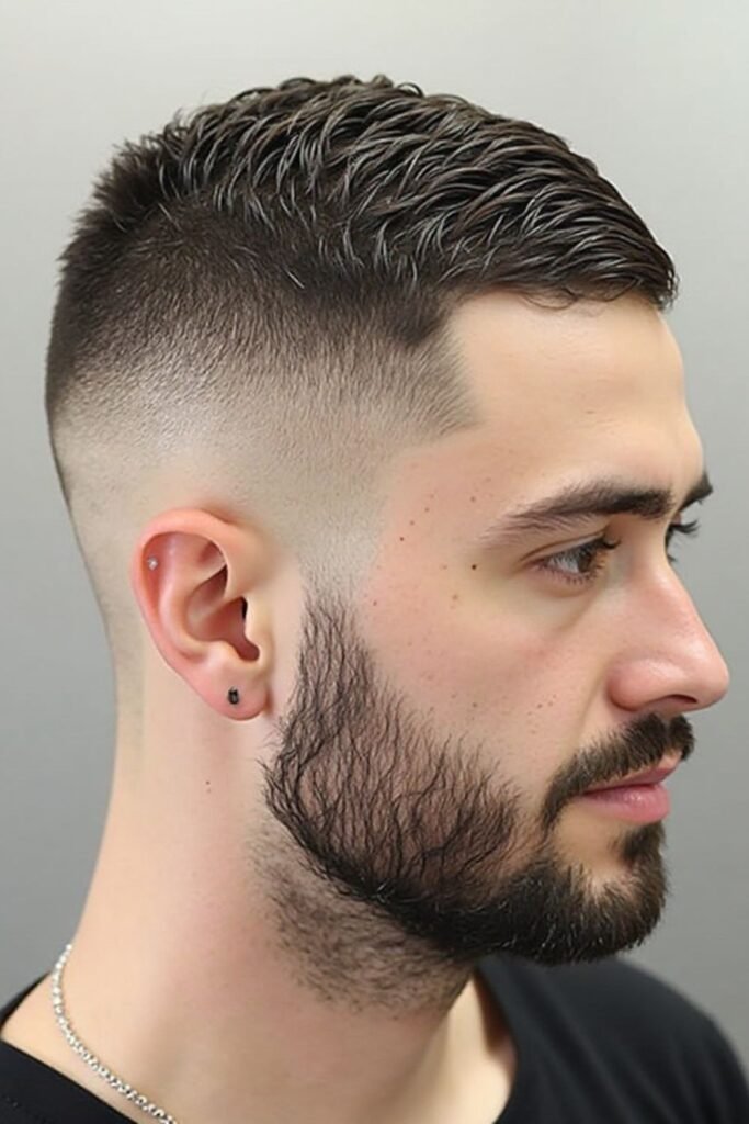 A buzz fade with a beard fade creates a seamless transition between the hair and facial hair. The gradual blending makes the beard look more connected to the haircut, producing a balanced and masculine appearance that feels modern.