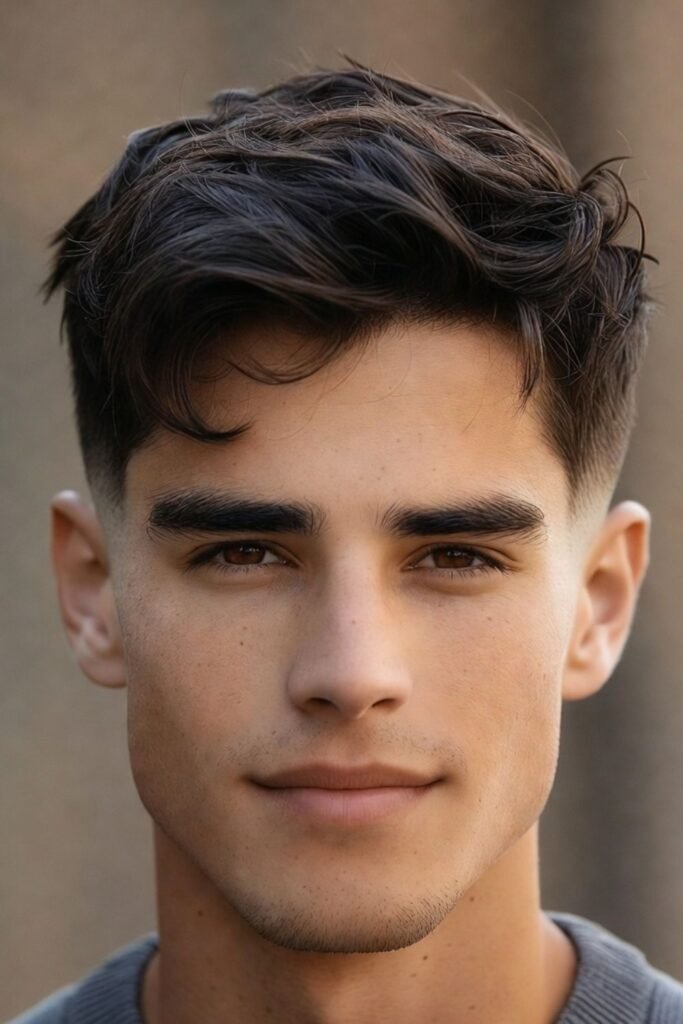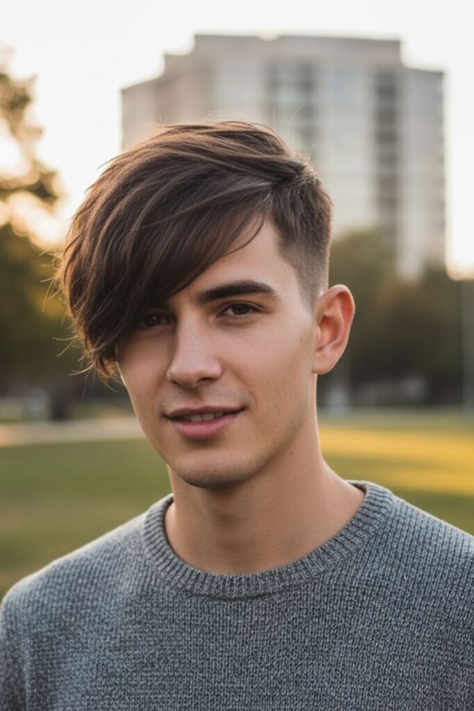 It suits round or oval face shapes. This style adds youthful energy and a contemporary edge for men who like trendy hairstyles.