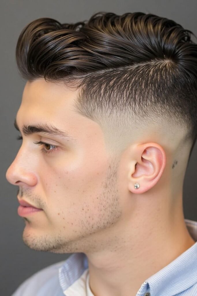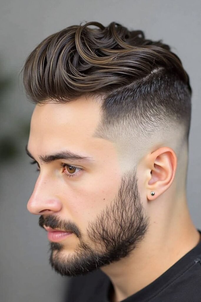 The mid fade with side part is a classic and professional hairstyle that never goes out of fashion. In this style, the hair is neatly divided into a side parting while the sides are gradually faded from the middle, creating a sharp and clean structure. This combination gives a very organized and gentleman-like appearance, making it one of the most popular choices among working professionals and business men.
