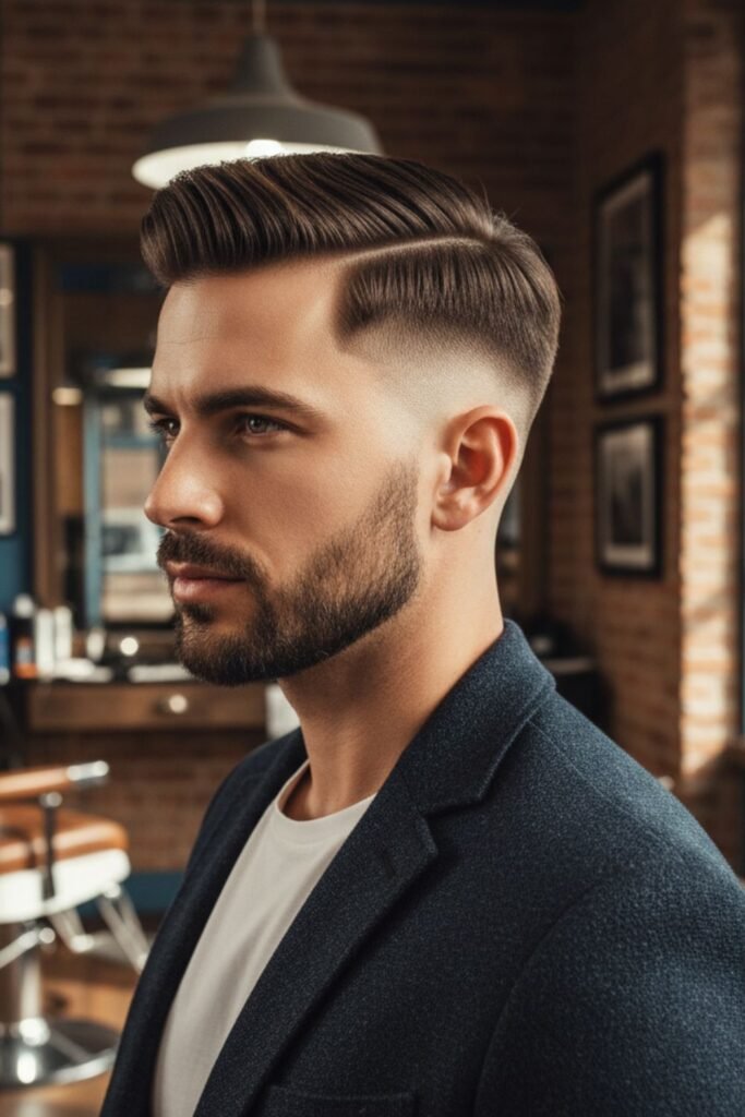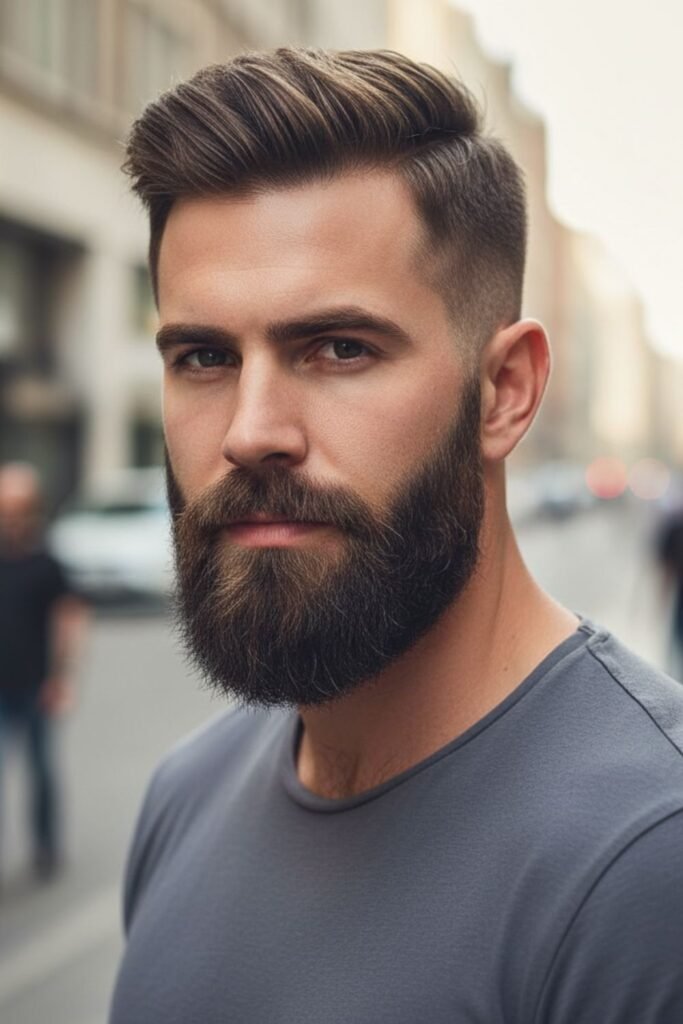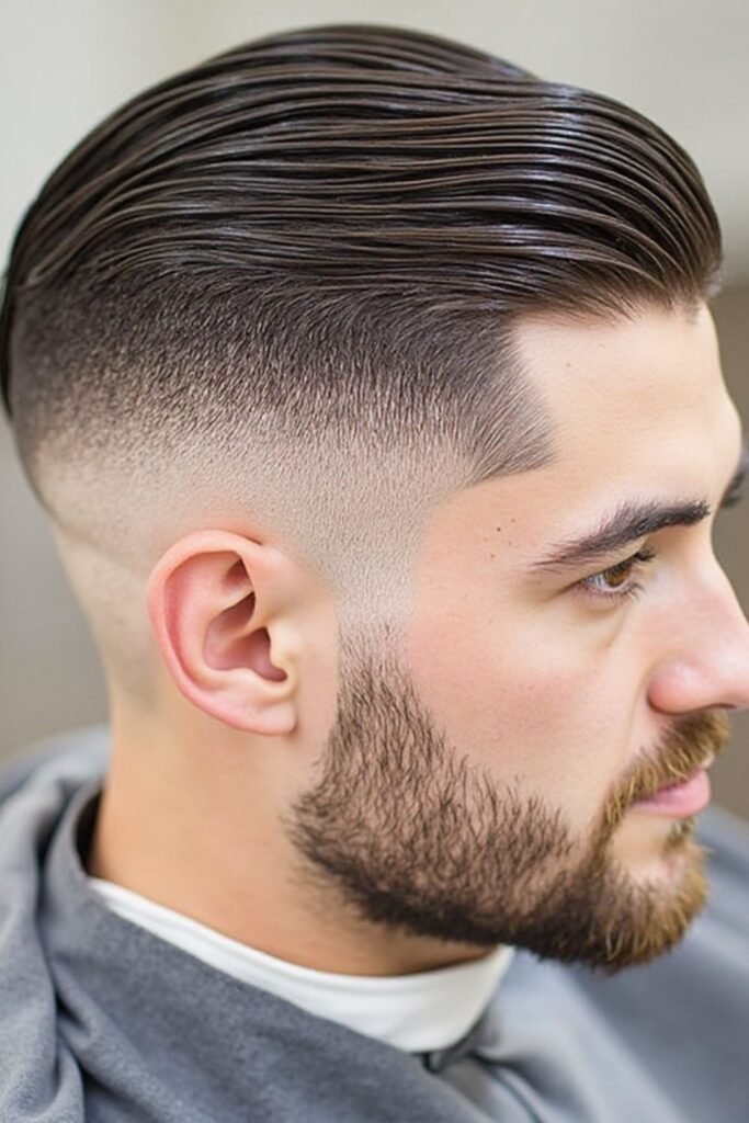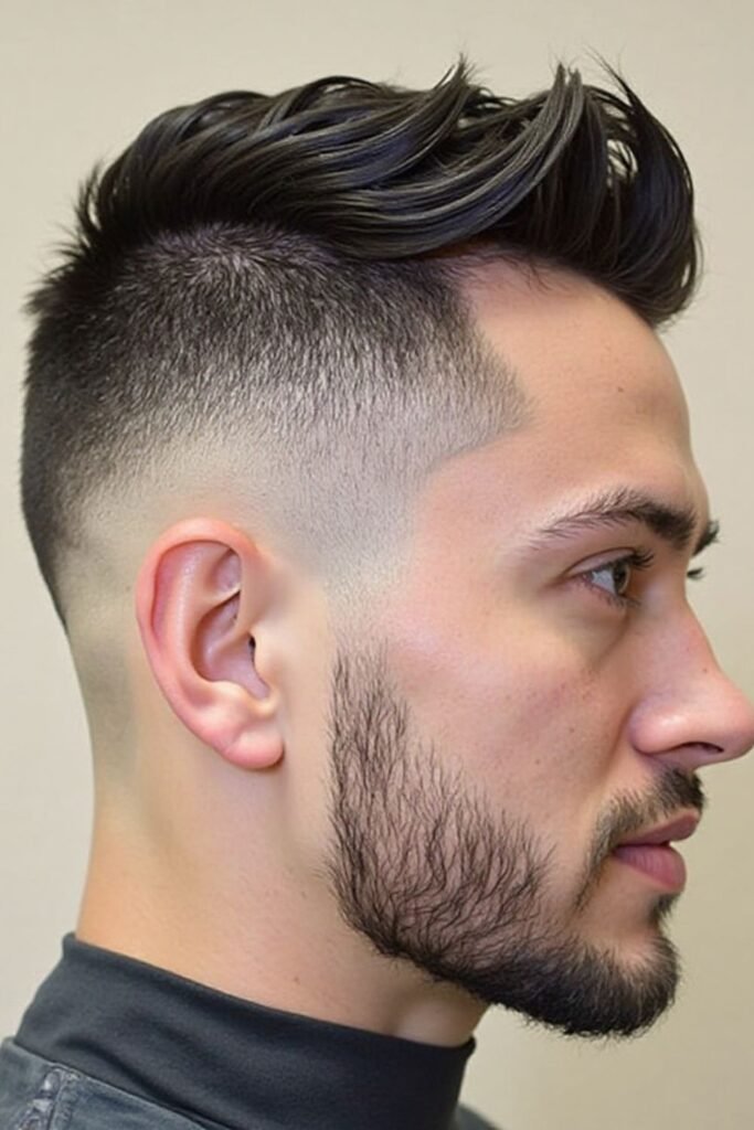 This haircut suits men who want a bold and mature style. It works well for both short and long beards. Regular trimming keeps the fade and beard looking sharp and well-maintained, giving a confident and professional impression.