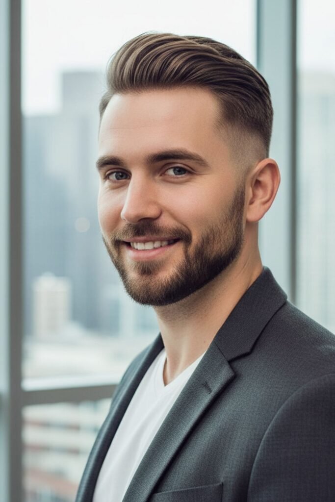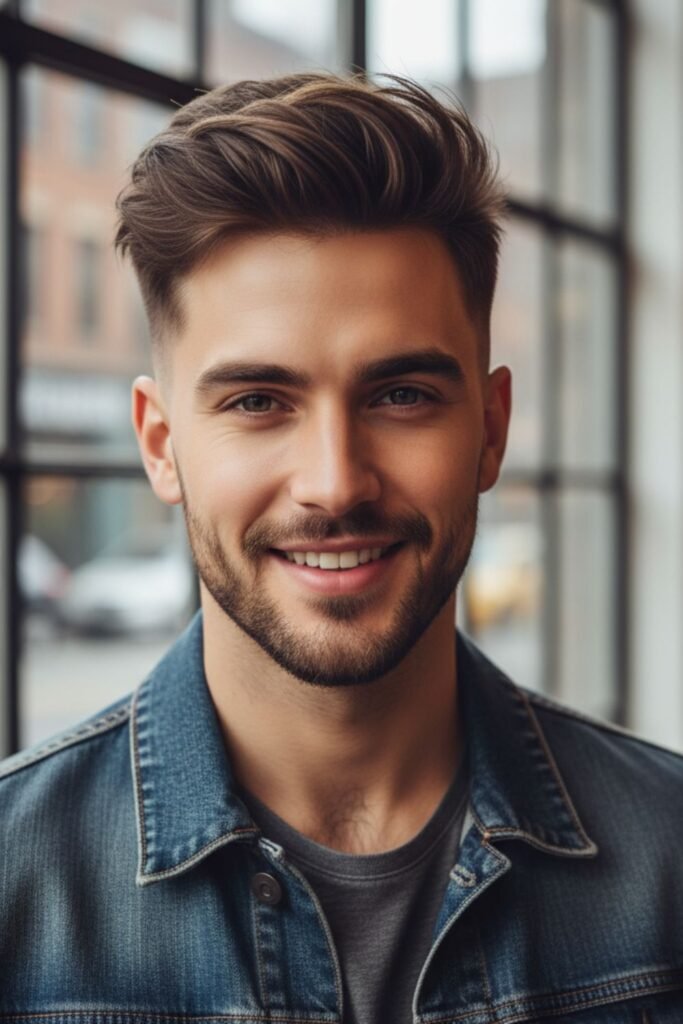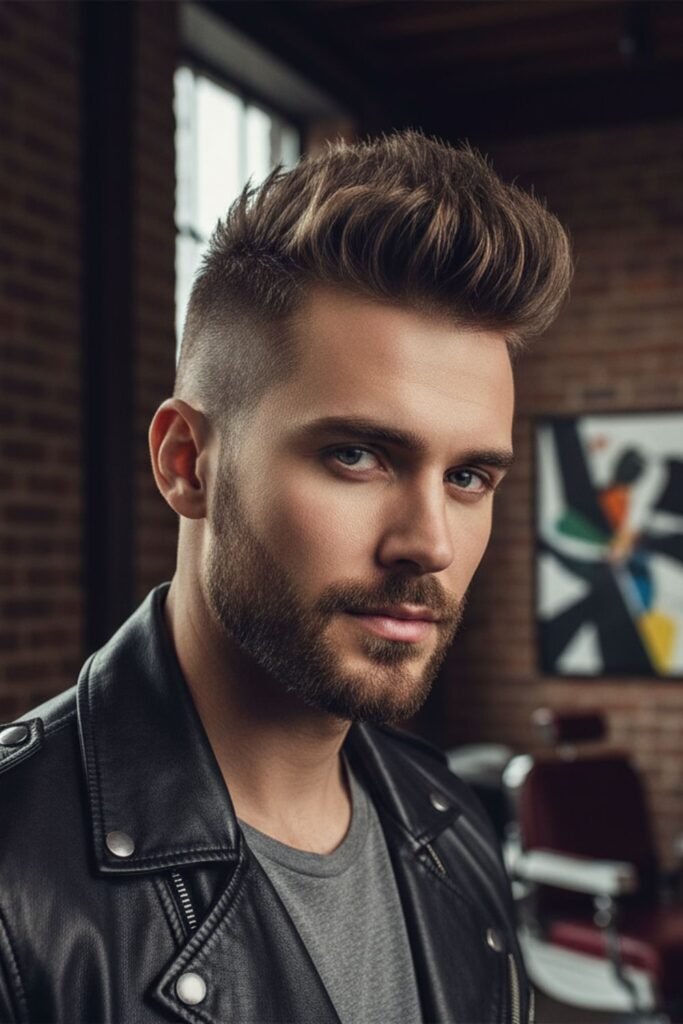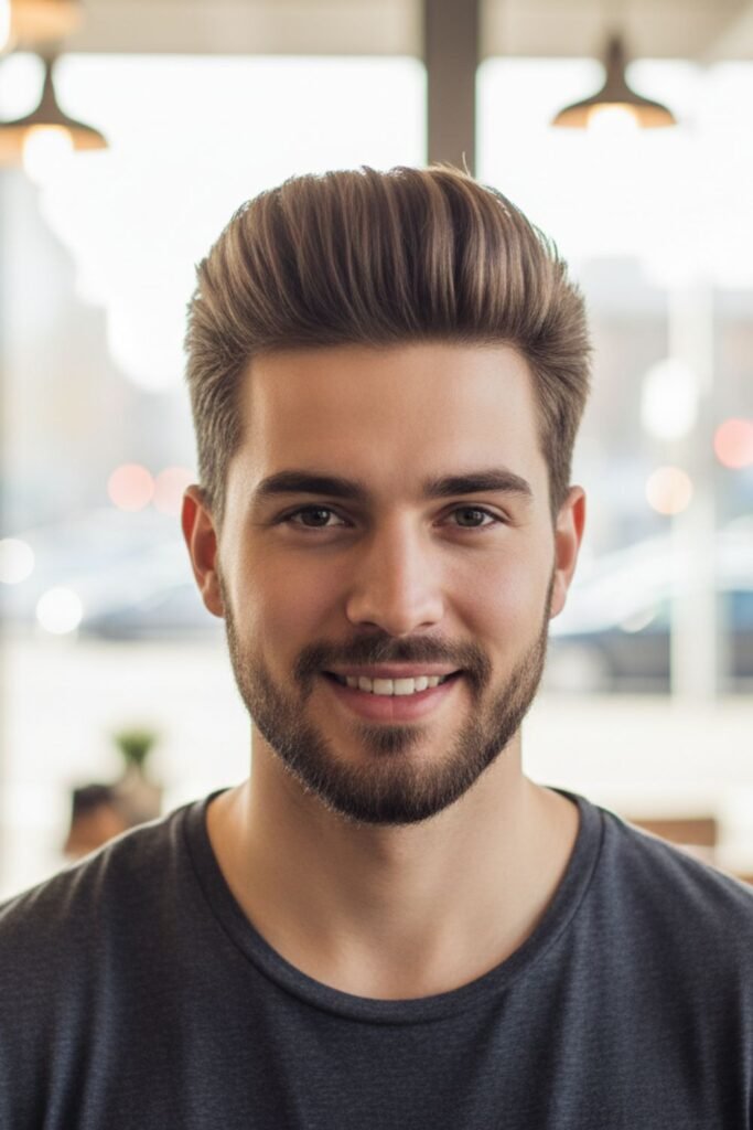 It works well for men with thick hair. Using a blow dryer and light styling product helps maintain the height and shape. The fade keeps the sides neat, giving a clean and sharp contrast with the brush-up top.