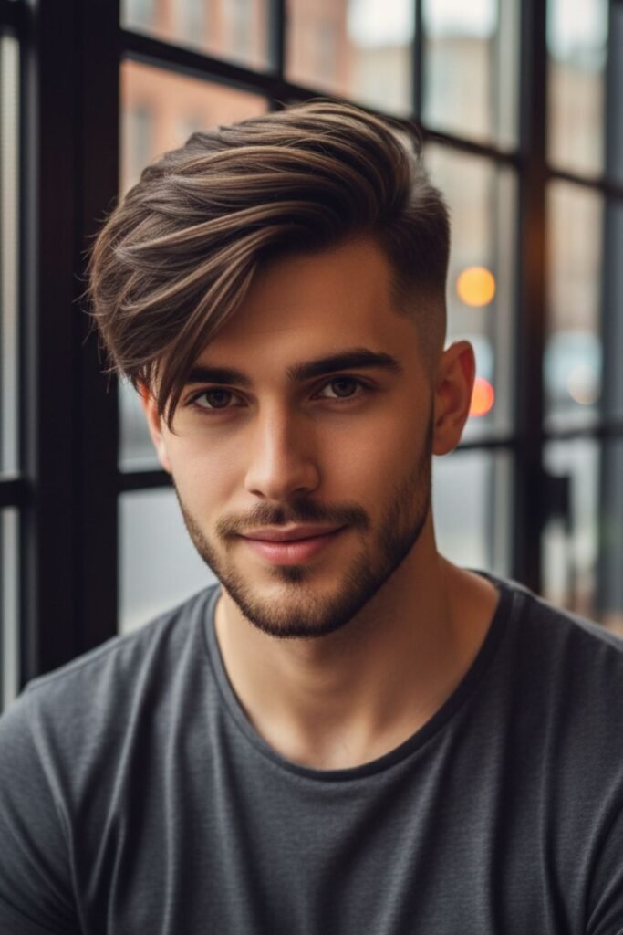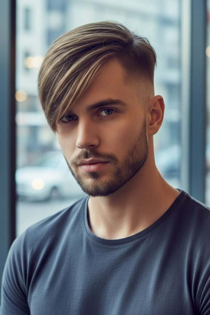 It works well with straight or slightly wavy hair. Using a light styling product helps maintain the sweep. The fade ensures the haircut looks sharp while giving a relaxed and fashionable top style.