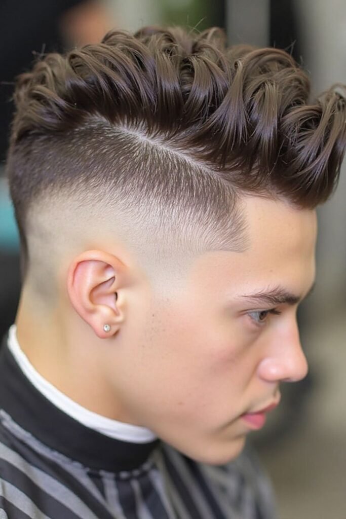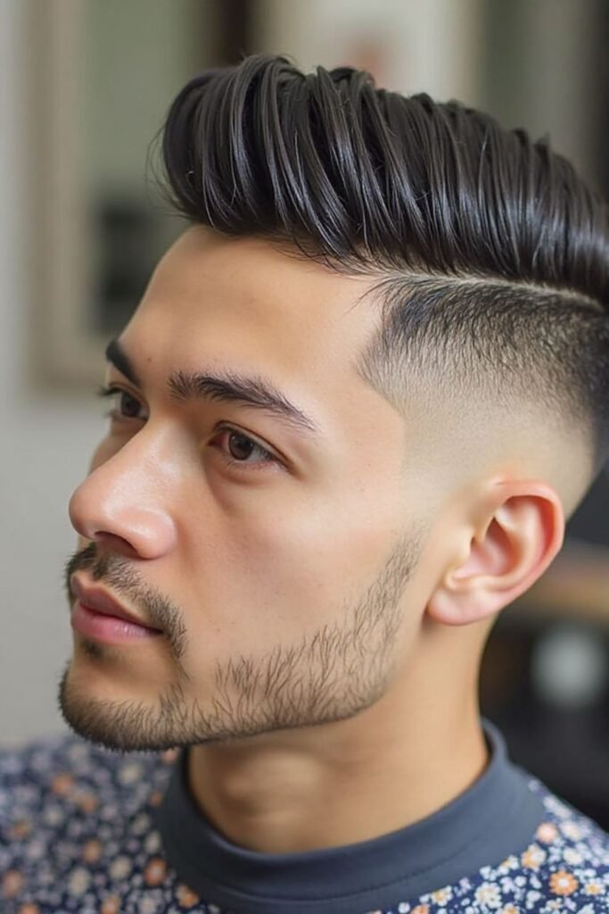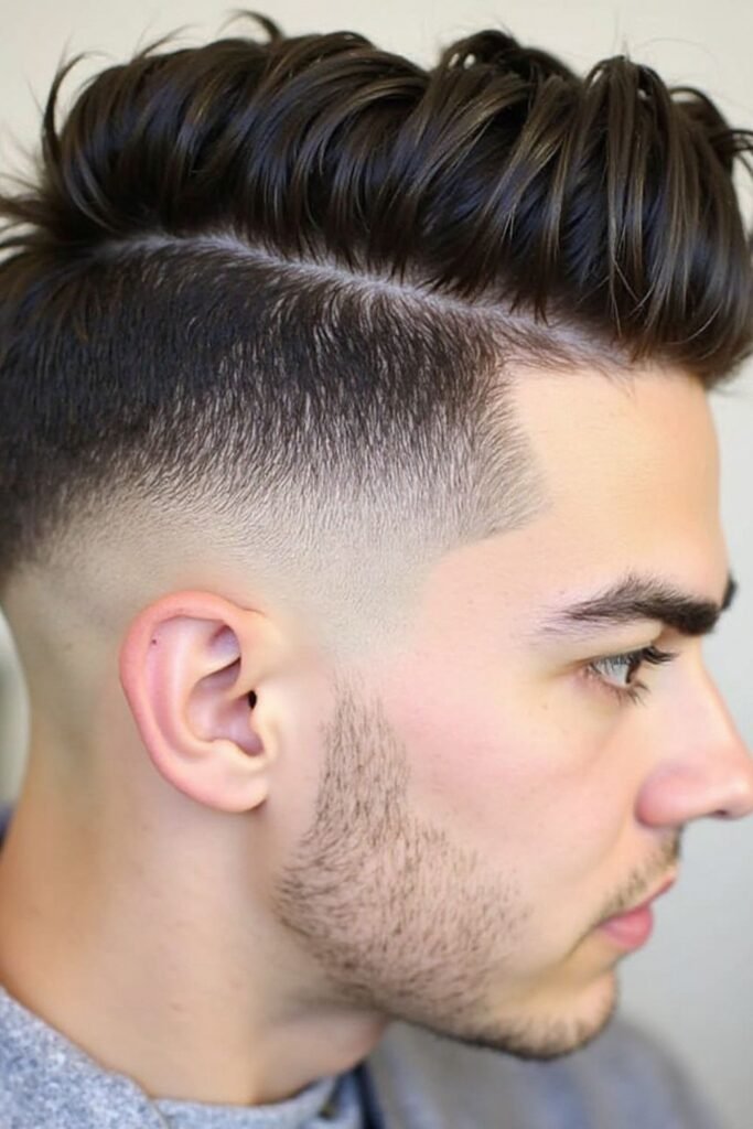 A skin fade with a pompadour creates a bold and stylish hairstyle that instantly grabs attention. The sides are shaved down to the skin while the top hair is lifted upward. This contrast adds height and gives the haircut a confident appearance.