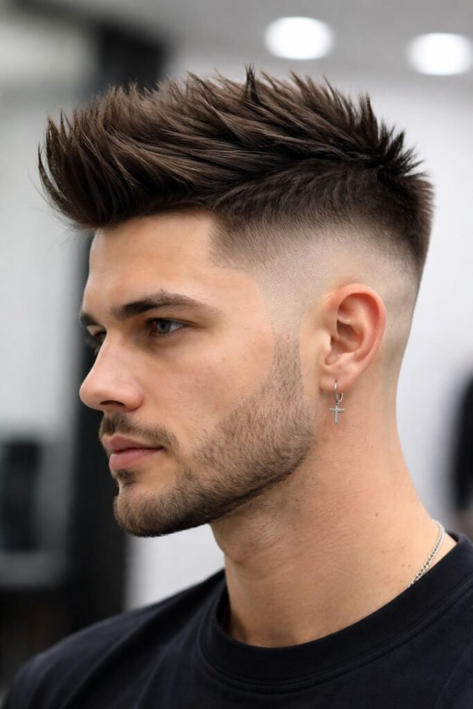 A skin fade with spiky hair creates a fun and energetic hairstyle that stands out. The short sides keep the look clean, while the top hair is styled into spikes. This adds texture and gives a bold, youthful vibe.