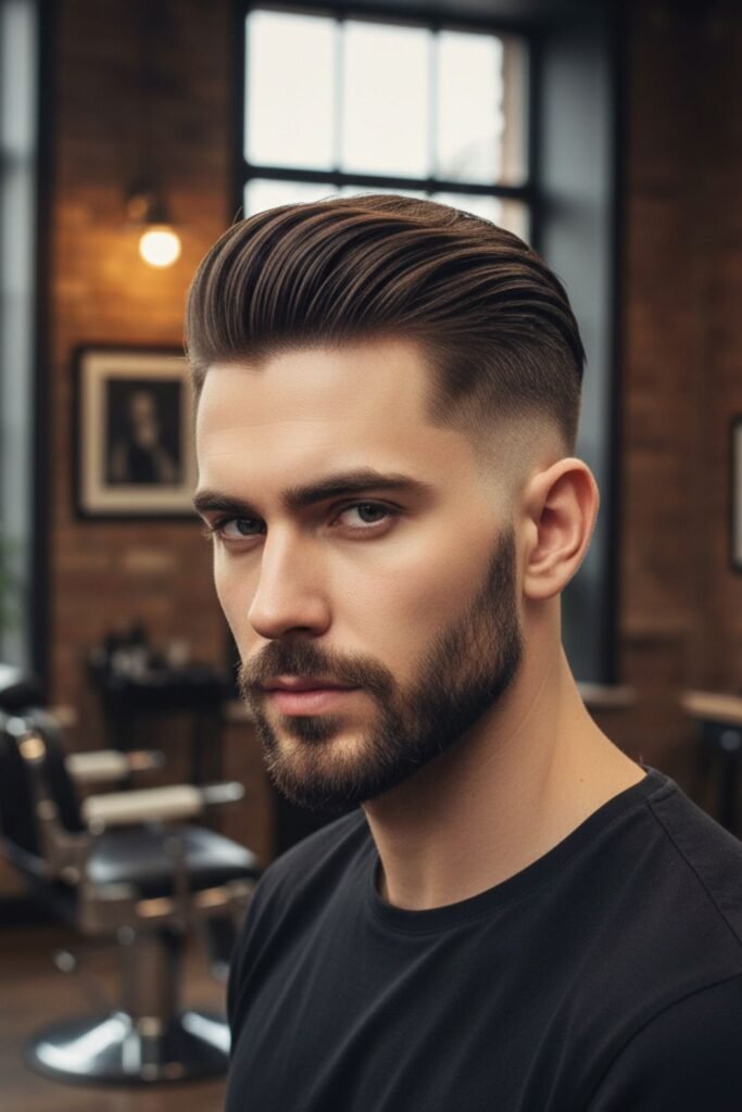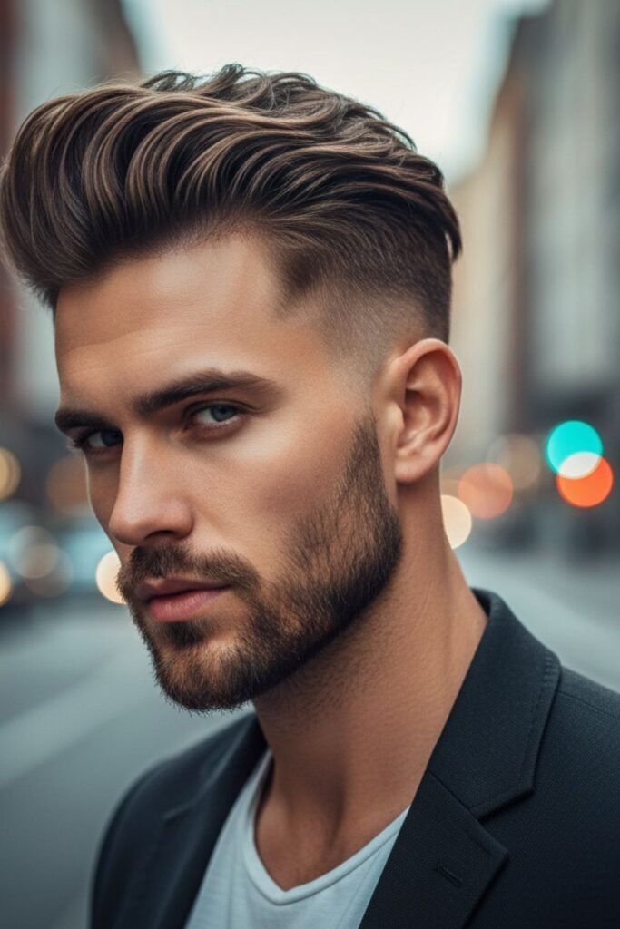 This haircut is perfect for men who enjoy a classic yet modern look. It works best with medium to thick hair and requires some styling product. Regular trimming helps maintain the clean fade and keeps the pompadour shape looking sharp.