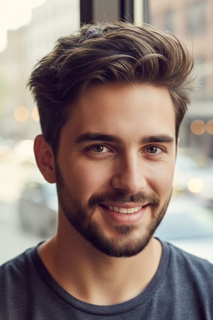 This style is perfect for men who like a relaxed and stylish look. It works well with hair products like pomade or wax. The textured top also makes thin hair appear fuller and more dynamic throughout the day.