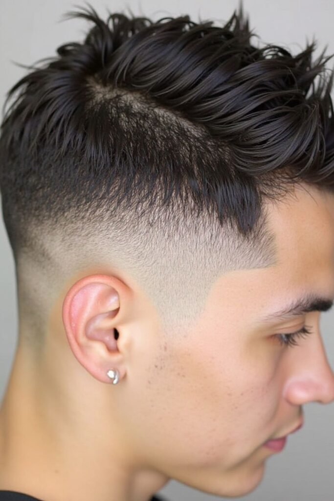 It works for men who want a statement hairstyle. The top can be styled messy, slicked back, or textured. Regular trimming keeps the fade sharp, maintaining the striking undercut appearance.